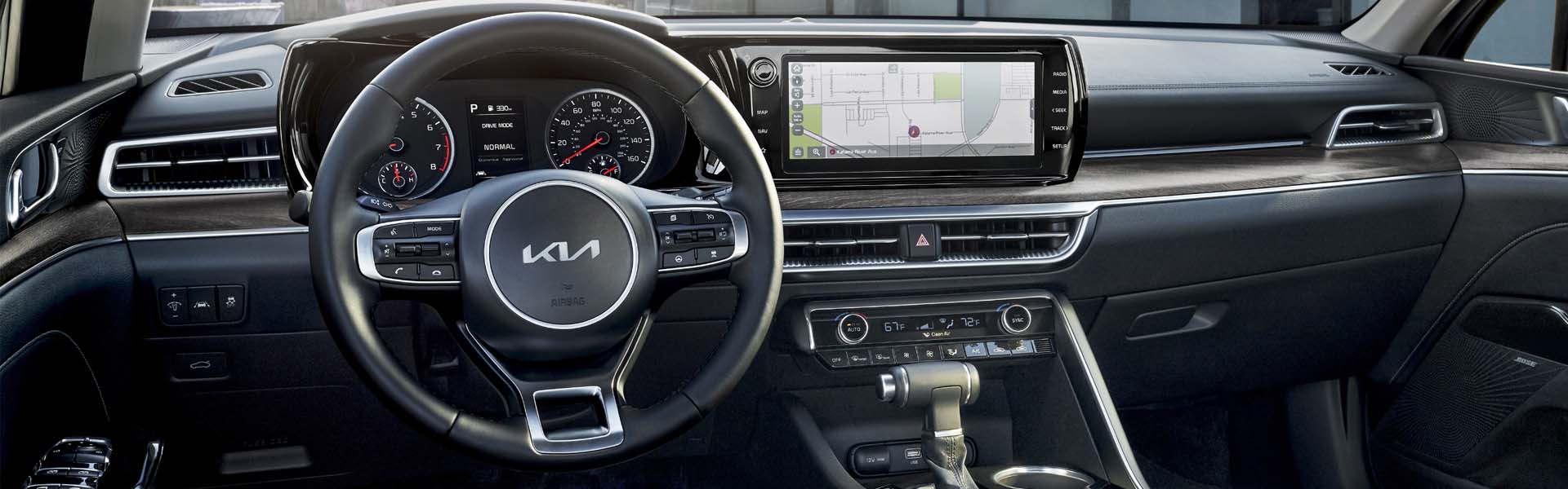 The K5's performance is enhanced by its wide-track suspension, which is the widest-in-class, offering responsive handling and agile steering. Available performance-enhancing 19-inch Pirelli P-Zero® tires allow for impressive control on the road. The optional all-wheel-drive system adds to the driving dynamics, providing enhanced traction and stability in various driving conditions.